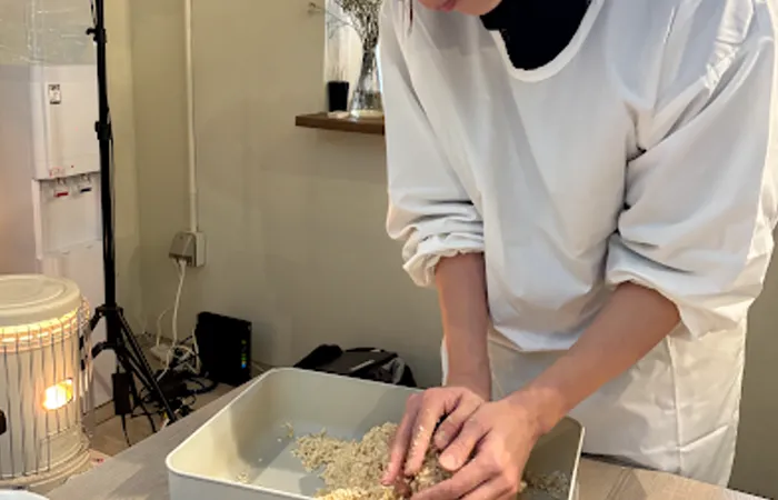 The sensation of crushing the soybeans, the sweet fragrance of the koji, the warm lighting, and the focused work created an almost meditative experience.
